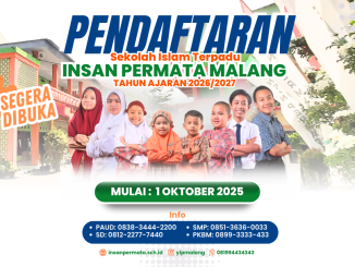 📢 SEGERA DIBUKA !!! PENERIMAAN MURID BARU SEKOLAH ISLAM TERPADU INSAN PERMATA(PAUD – SD – SMP – PKBM)TAHUN AJARAN 2026/2027 🥁 Mulai 1 OKTOBER 2025Pendaftaran Online :📱 insanpermata.sch.id 🚨Info lebih lanjutWA: 081994434343IG: @yip.malang