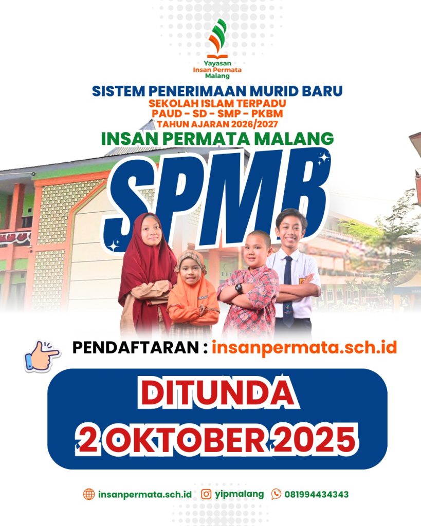bersama ini kami sampaikan, bahwa SPMB INSAN PERMATA MALANG (PAUD-SD-SMP-PKBM) DITUNDA 1 HARI sehingga pendaftaran baru akan dimulai pada tanggal 2 OKTOBER 2025. Hal ini disebabkan adanya maintenance website yayasan sehingga pendaftaran masih belum bisa diakses.